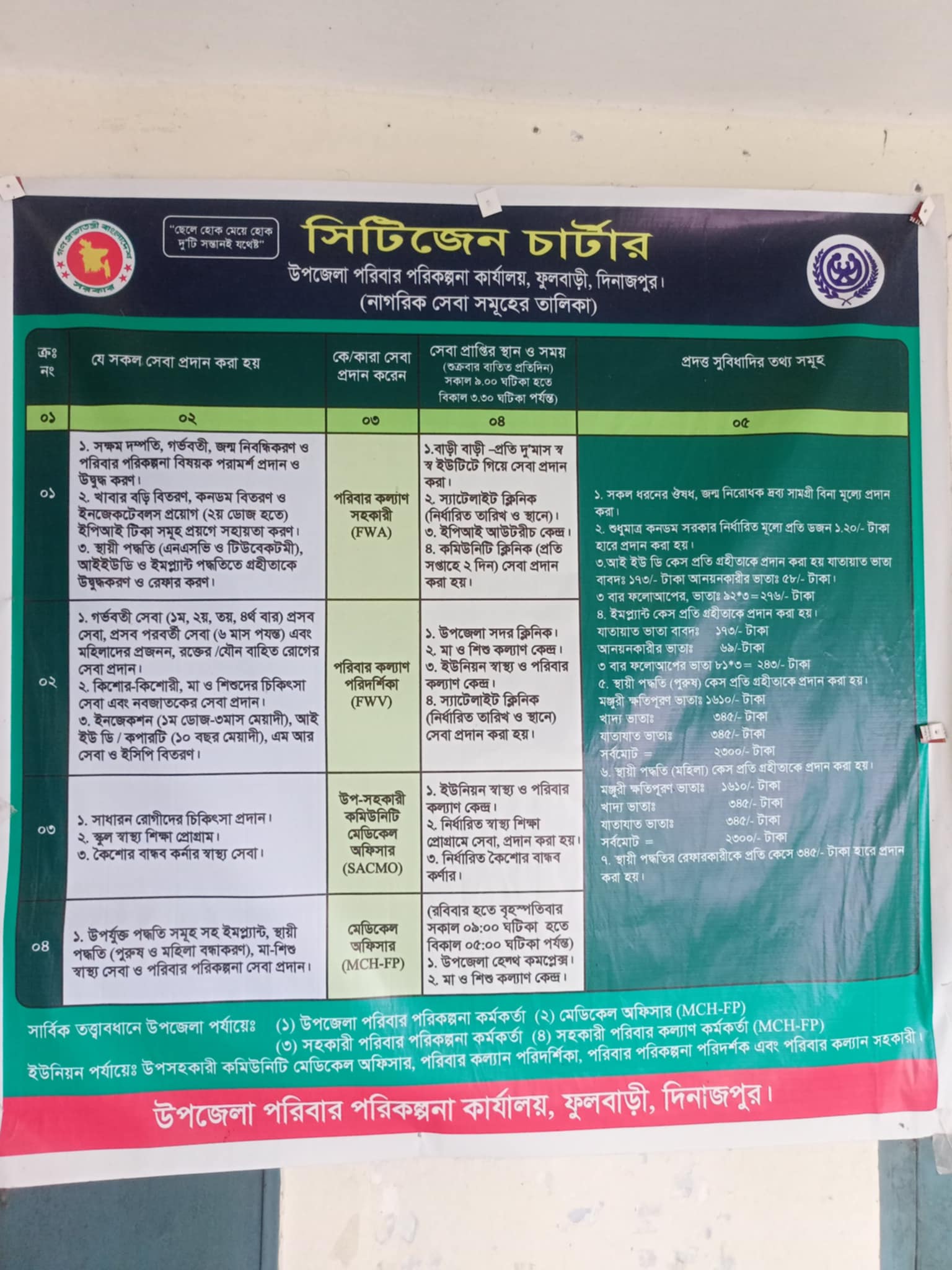 | (খ) পরিবার পরিকল্পনা সেবা (বিনামূল্যে প্রদত্ত) * পরিবার পরিকল্পনা বিষয়ক পরামর্শ প্রদান। * খাবার বড়ি। * জন্মনিরোধক ইনজেকটেবলস্ * আই ইউ ডি/কপারটি * ই সি পি (গ) অন্যান্য সেবা (বিনামূল্যে প্রদত্ত) * সাধারণ রোগীর সেবা * বয়: সন্ধিকালীন সেবা (কৈশোর প্রজনন স্বাস্থ্য সেবা) * স্বাস্থ্য শিক্ষামূলক সেবা (ঘ) প্রয়োজনে যে কোন রোগীকে উচ্চতর সেবা কেন্দ্রে প্রেরণ (রেফার) স্যাটেলা্ট ক্লিনিক (ওয়ার্ড পর্যায়) (ক) মা ও শিশু স্বাস্থ্য সেবা (বিনামূল্যে প্রদত্ত) * গর্ভবতী সেবা * গর্ভোত্তর সেবা * এম আর সেবা * সাধারণ রোগীর সেবা * ৫ বছরের কম বয়সী শিশুদের সেবা * প্রজননতন্ত্রের/ যৌনবাহিত রোগের সেবা * ই, পি, আই সেবা * ভিটামিন এ ক্যাপসুল বিতরণ * স্বাস্থ্য ও পুষ্টি বিষয়ক শিক্ষামূলক সেবা (খ) পরিবার পরিকল্পনা সেবা (বিনামূল্যে) * পরিবার পরিকল্পনা বিষয়ক পরামর্শ প্রদান * খাবার বড়ি * জন্মনিরোধক ইনকেটেবলস্ * আই ইউ ডি/ কপারটি * ই সি পি (গ) সরকার নির্ধারিত মূল্য প্রদান সাপেক্ষে প্রদত্ত সেবা * কনডম-১ (এক ডজন ১ (এক) টাকা (২০) বিশ পয়সা বাড়ী পরিদর্শনের মাধ্যমে প্রদত্ত সেবা (পরিবার কল্যাণ সহকারী কতৃৃক (ক) বিনামূল্যে প্রদত্ত সেবা * পরিবার পরিকল্পনা বিষয়ে সক্ষম দম্পতিদের উদ্বুদ্ধকরণ * খাবার বড়ি বিতরণ * ইনজেকশন প্রদান (২য় ও তৎপরবর্তী ডোজ) * আই ইউ ডি, ভ্যাসেকটমী/ এনএসভি (স্থায়ী পদ্ধতি) পুরুষ ও টিউবেটমী (স্থায়ী পদ্ধতি) মহিলা গ্রহিতার প্রাথমিক বাছাইকরণ ও সেবা কেন্দ্রে আনয়ন * ঝুকিপূর্ণ গর্ভবতী মা সনাক্তকরণ ও যথাযথ সেবা কেন্দ্রে প্রেরণ । সিএসবিএ কর্তৃক প্রদত্ত সেবা (বিনামূল্যে প্রদত্ত সেবা) * বাড়ীতে স্বাভাবিক প্রসব সেবা * নবজাতকের সেবা * জটিল রোগী সনাক্তকরণ ও যথাযথ সেবা কেন্দ্রে প্রেরণ